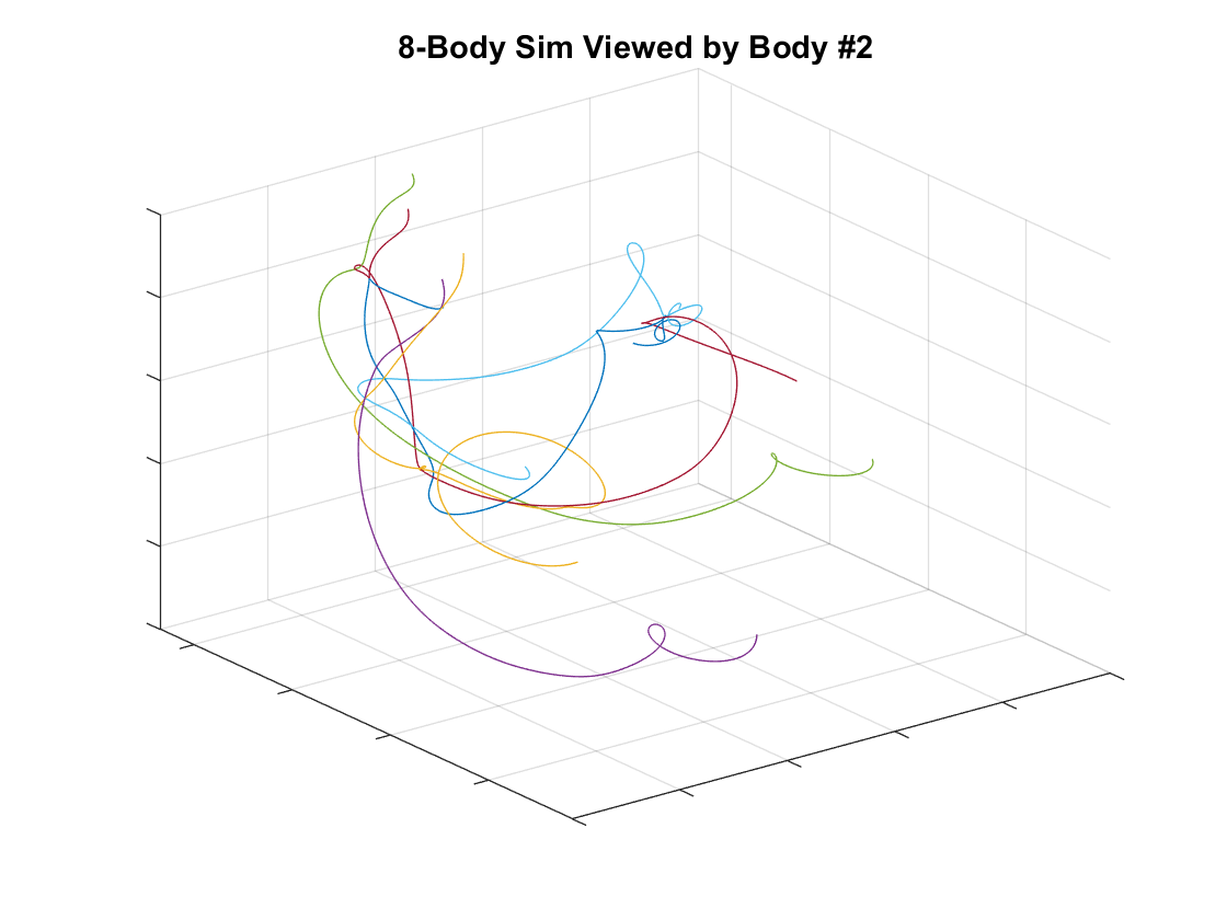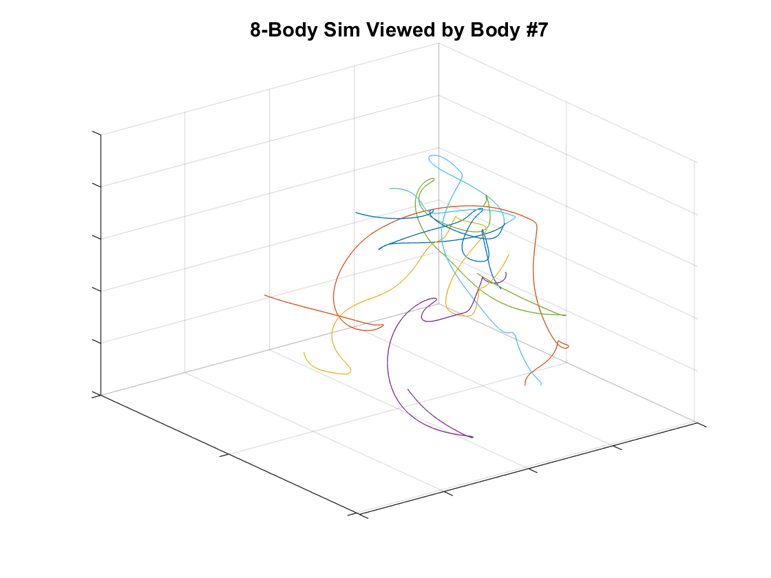 To the right we can see another 8 body system from an inertial viewpoint. Below we have the same 8 body system that the graph to the right shows, but from two different viewpoints. Instead of being fixed in space and letting the bodies evolve over time, we fix our viewpoints on a single body and observe the rest of the bodies evolve over time. They both describe the same system, but look completely different because our viewpoints are evolving over time. Without the title it would be easy to mistake them for two different systems.